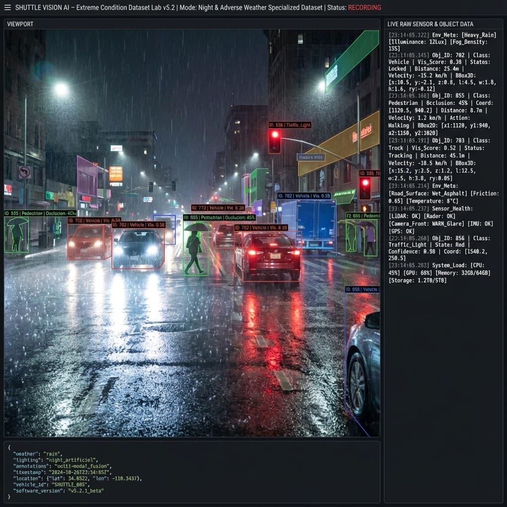 - 환경적 다양성 극대화: 폭설, 폭우, 저조도 야간 주행, 역광 등 카메라와 라이다 센서가 취약한 환경을 타겟팅하여 데이터를 구축함으로써 모델의 강건성(Robustness)을 확보합니다.