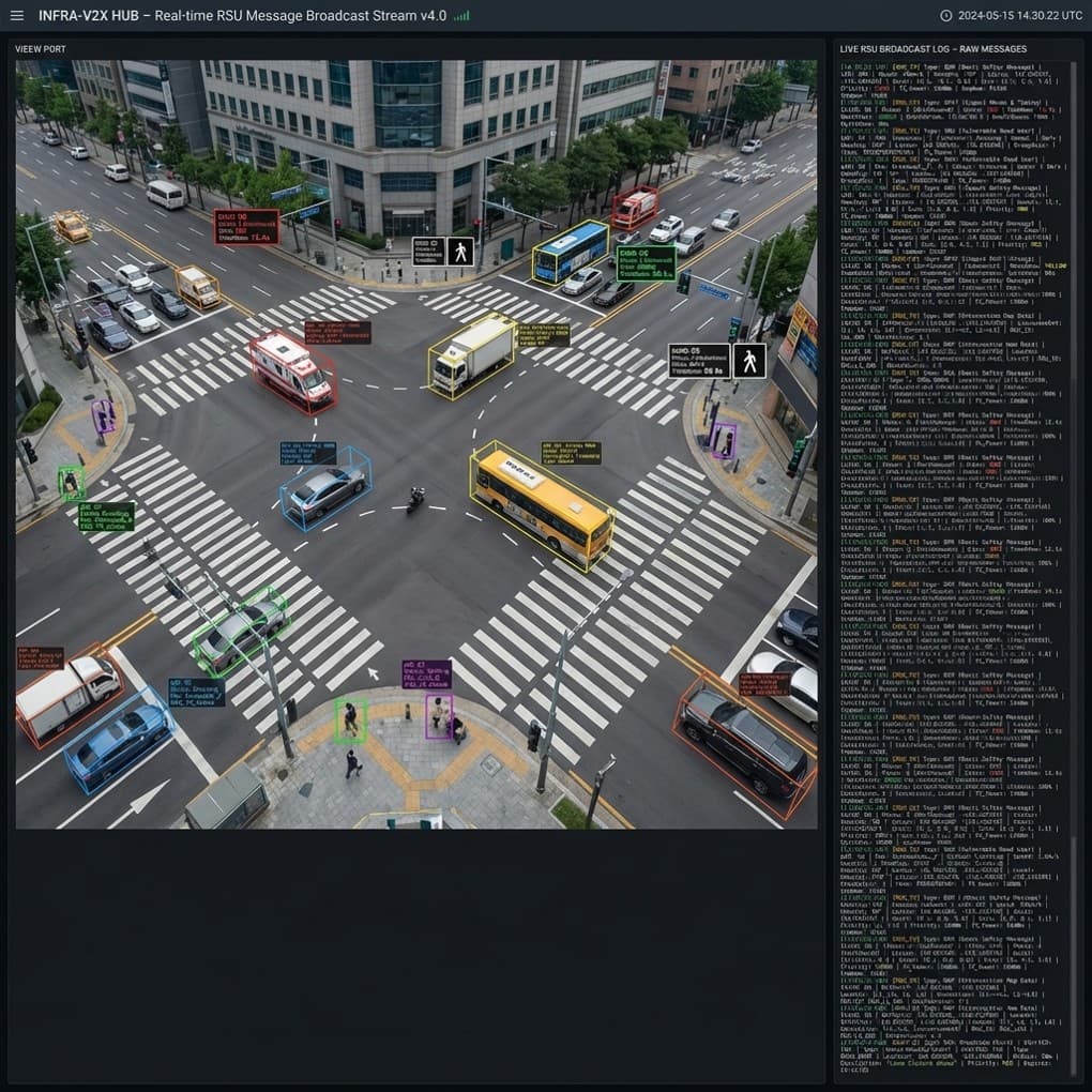 - 객체 탐지 및 추적(Detection & Tracking): 전방위 카메라 및 라이다 데이터를 활용하여 차량, 이륜차, 퍼스널 모빌리티(PM), 보행자의 이동 경로를 추적(ID Tracking)합니다.