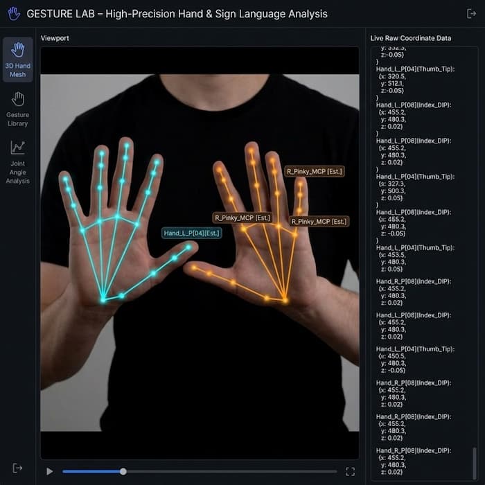 • 정밀 제스처 분석: 손가락 마디마디의 관절과 손등의 구조를 파악하여 복잡한 수어나 기기 조작 제스처를 데이터화합니다.